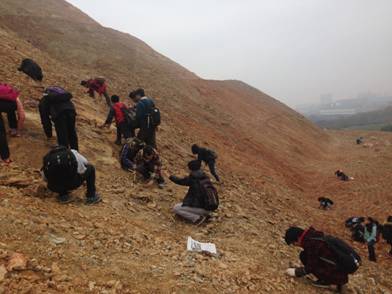通讯员:田力2015年11月28日,地球科学学院2014级地质学基地班同学,前往武汉市江夏区花山大道附近,进行了《古生物学》的野外教学活动。师生一行四十余人,不畏冬雾天的寒风,一到达现场,就爬到山上的露头边,一锤一锤的寻找已经在岩石中沉睡了四亿多年的志留纪生物化石标本。