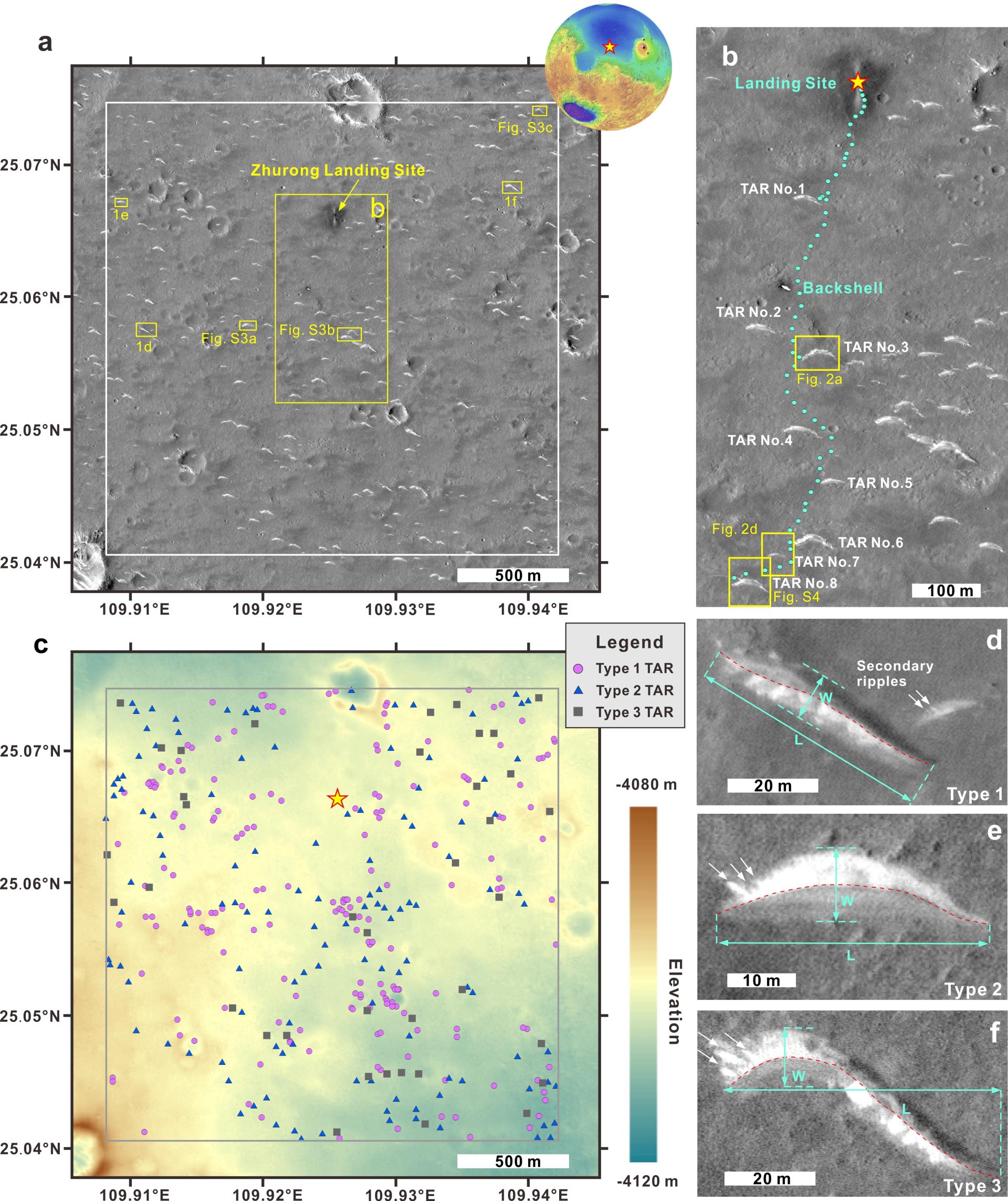 2021年5月,我国“天问一号”探测器携带的“祝融号”火星车着陆于乌托邦平原南部(109.925°E,25.066°N),在其着陆及巡视范围内分布有大量的横向风成脊(Transverse Aeolian Ridge, TAR;图1)。TAR是火星表面一类特殊的风成地貌,是研究火星大气运动及气候特征的重要载体。本文利用高分辨率遥感数据,在着陆区2 km×2 km范围内识别出354个TARs,并根据形态特性划分出三个类型(Type 1,Type 2和Type 3;图1),提出了该区域TARs的两阶段演化模型(图4a),指示着陆区当地的盛行风向曾经发生过一次显著的改变。
