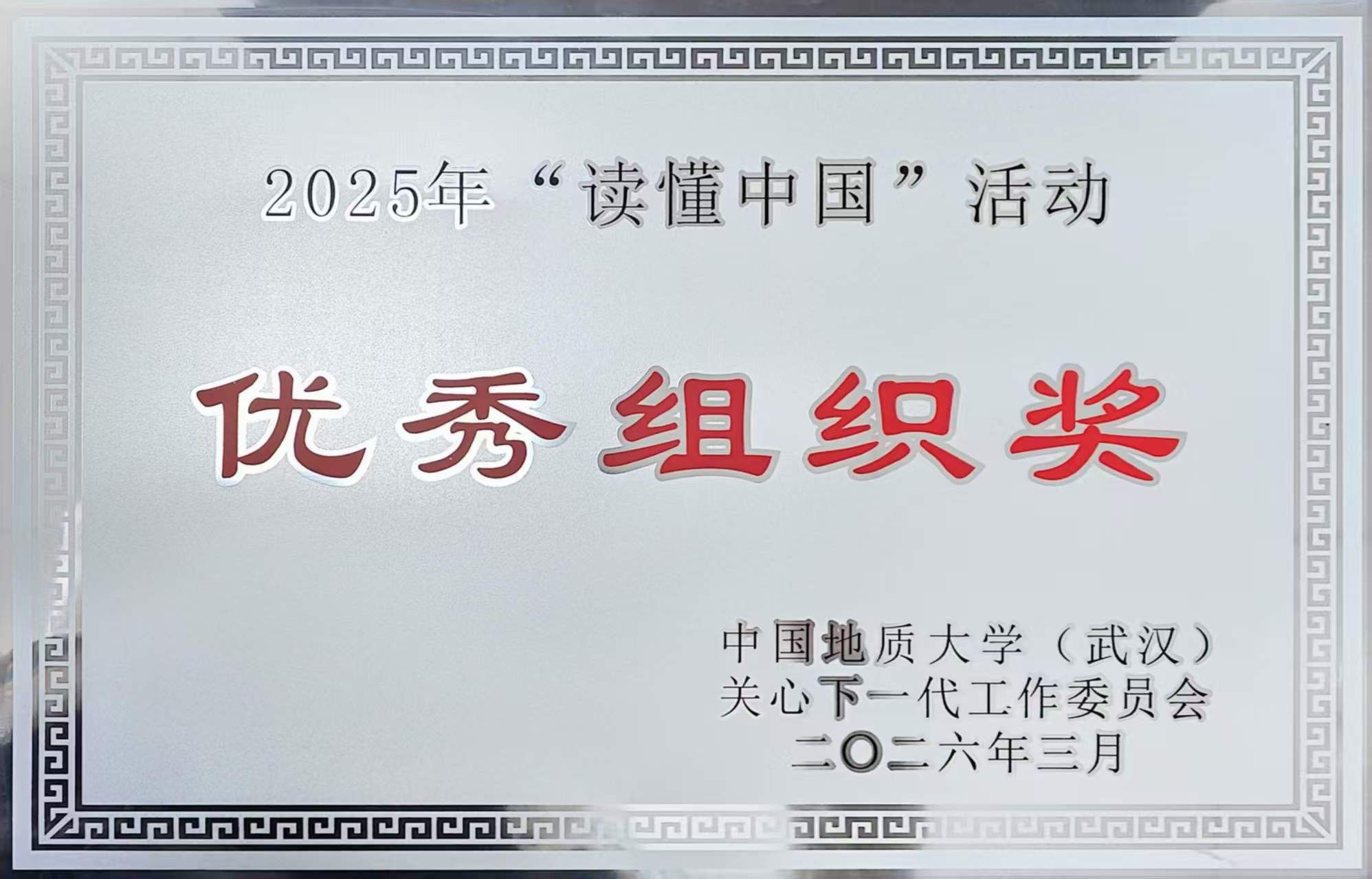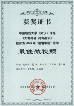 地球与行星科学学院在湖北省教育厅关工委“读懂中国”系列活动中喜获佳绩:学院获评学校2025年“读懂中国”活动优秀组织单位,由黄志炜、尚媛媛老师共同指导的微视频作品《大地师者 润育嘉禾》荣获2025年湖北省教育厅关工委“读懂中国”最佳微视频奖。