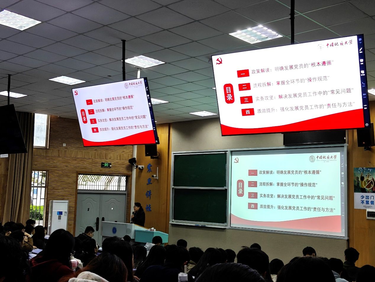 为进一步加强学生党务工作队伍建设,切实提升基层党建工作规范化、专业化水平,116日下午,地球科学学院、工程学院、机电学院、外国语学院在教三楼联合举办强基提质 联学共进党务工作专题培训。校级专职组织员于荣萍老师担任主讲,辅导员秦傲、彭友元、刘彪、黎颖及160余名学生党务工作骨干参加。本次培训由地球科学学院辅导员秦傲主持。