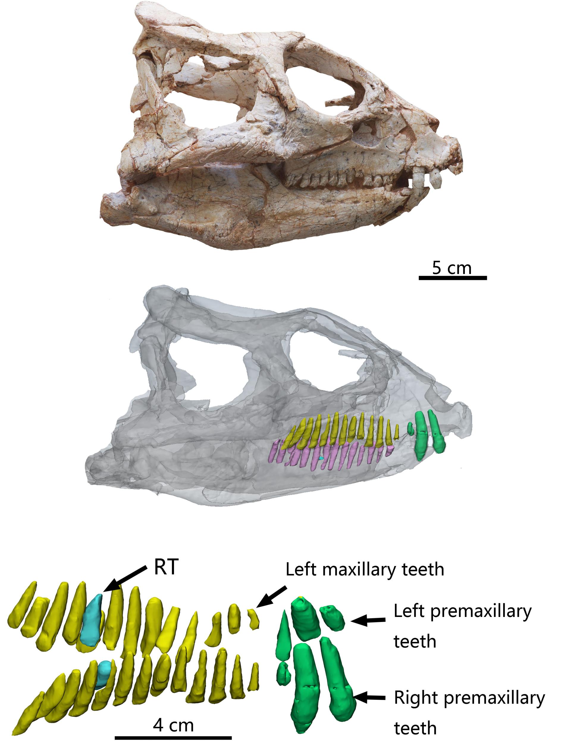 Figure 3. Photograph (upper left) and transparent reconstructions (upper right) of the skull of Chaoyangsaurus. 3D models of the upper jaw (lower left) and lower jaw (lower right) dentitions.