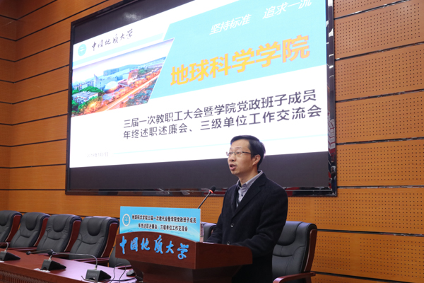 2019年1月7日上午,地球科学学院在东教楼召开三届一次教代会暨学院党政班子成员年终述职述廉会、三级单位工作交流会。校工会常务副主席喻芒清到会宣读校工会关于同意地球科学学院召开三届一次教代会的批复文件。会议分三阶段进行,由党委书记王甫主持。