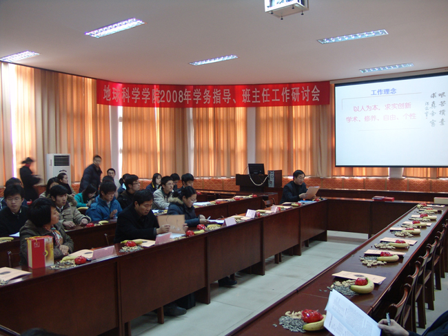 2008年12月18日地球科学学院召开学务指导、班主任工作研讨会,副校长欧阳建平、教务处副处长庞岚、校团委书记鲍清芬、院党委书记赵俊明、副院长曾克峰、副院长兼010071班主任周汉文莅临会议并指导工作。会议由院党委副书记徐士元主持,院全体学务指导、班主任老师,德育工作组全体老师以及院团学联、各年级班级学生代表共同参与了会议。