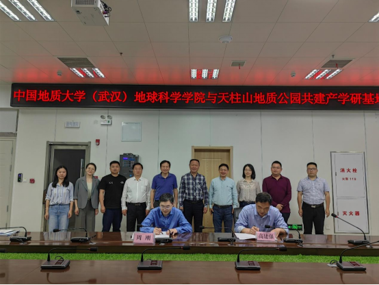 5月13日,地球科学学院党委书记周刚、副院长朱宗敏、图书档案与文博部部长刘先国、校宣传部副部长陈华文等一行7人赴安徽天柱山世界地质公园开展产学研合作考察调研并举行签约仪式。安徽省潜山市市委常委、天柱山管委会常务副主任舒寒冰、天柱山风景区党委委员二级调研员张方,天柱山风景区党委委员、天柱山地质公园管理中心主任高建强、天柱山地质公园管理中心副主任黄雯等出席了合作座谈会和签约仪式。