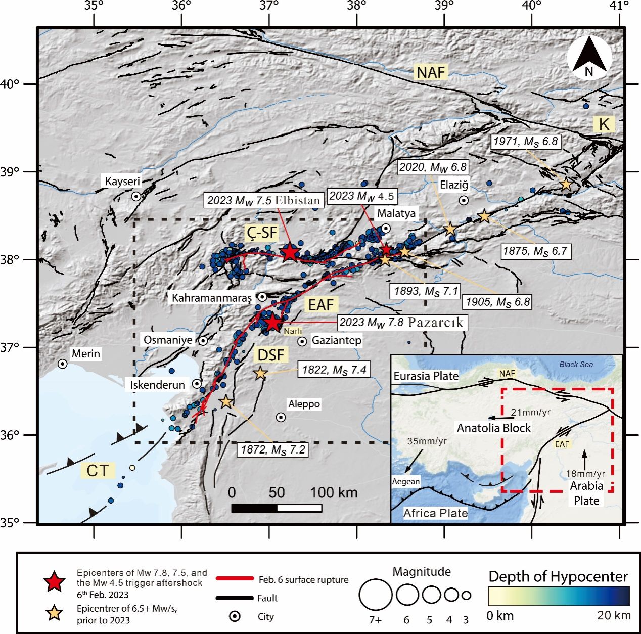 2023年2月6日的土耳其东部大地震,是该区本世纪以来破坏性最大的地震事件,共造成59,259人死亡,1,488亿美元损失(土耳其GDP的9%)。中国地质大学地球科学学院、地质过程与矿产资源国家重点实验室和湖北巴东地质灾害国家野外科学观测研究站Timothy Kusky教授研究团队在国家自然科学基金委“特提斯地球动力系统”重大研究计划重点项目“大陆碰撞侧向逃逸和初始板块边界的形成”支持下,自2017年开始在土耳其开展新构造和大地构造演化研究。该研究计划也是中国国家自然科学基金委第一个系统性鼓励中国科学家走出国门、在境外开展研究,彰显中国研究实力和国际视野的重大研究计划项目。