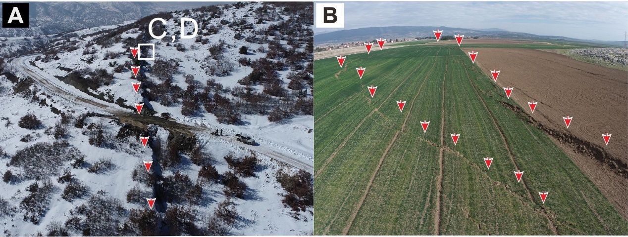 2023年2月16日,土耳其首震发生后第十天,Kusky研究团队将项目组成员博士生孟建南派达震区,与项目组海外合作者成员土耳其中东技术大学地质工程学院院长、中国地质大学(武汉)客座教授Erdin Bozkurt教授共同开展震后地质调查。项目组在地表破裂痕迹被降雨、洪水、灾后重建以及其他震后变形作用破坏之前,对与该次地震事件造成死海断层、东安纳托利亚断层的地表位移进行系统实地测量,并选取代表性区域,对地震导致的地表破裂进行厘米级无人机填图,并以数字地图的形式永久保存。这是人类历史上震后罕见和及时的地表破裂变形原始记录,为大型走滑型地震事件导致的地表变形、破裂在复杂断层系统之间的传播机制提供了重要参考。文章成果于2024年1月19日发表在《Science》期刊,并作为Research Highlight推荐。第一作者为中国地质大学(武汉)地球科学学院2018级博士生孟建南和Timothy Kusky教授,共同通讯作者为Timothy Kusky教授和美国地质调查局Walter Mooney教授,共同作者还包括土耳其中东技术大学地质工程学院Erdin Bozkurt教授,土耳其哈卡里(Hakkari)大学工程学院Mehmet Nuri Bodur教授和地质过程与矿产资源国家重点实验室王璐教授。