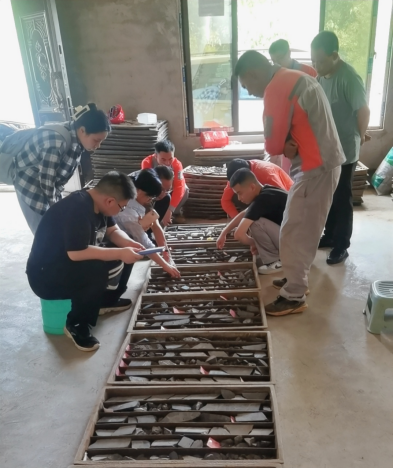 学习完苟坝会议精神后,团队一行前往106地质大队的临时野外工作现场,实地观察铝土矿岩心样品。带队专家及老师详细讲解了铝土矿岩心中典型矿石结构和矿物组成,并指导团队成员学习钻孔岩心的系统编录方法。随后在106地质大队的带领下,前往仙人岩矿区观察铝土矿富矿地层露头及其与周围地层的接触关系,并在铝土矿含矿岩系中发现了保存较好的植物根系化石,这为研究铝土矿形成过程提供了新线索。此外,专家在野外还详细讲解了铝土矿的找矿、选冶、综合利用以及矿区生态修复等关键流程。这些流程与贵州省的“富矿精开”战略紧密相连,旨在通过科学管理和技术创新,提高铝土矿资源的利用效率,同时保护和修复矿区生态环境,确保资源的可持续开发。这些流程的讲解让团队成员对铝土矿的整个生命周期有了全面的了解,特别是“富矿精开”战略的实施,让成员们认识到了科学管理和技术创新在资源开发中的重要性。