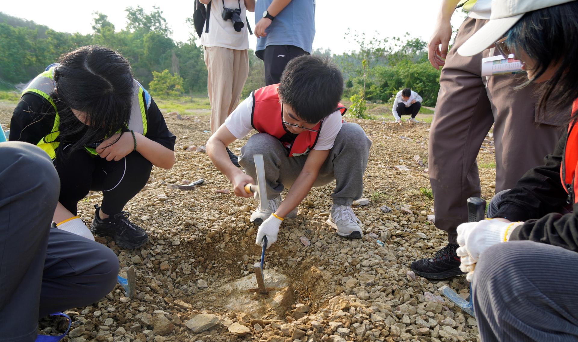 世界地球日组织学生赴蔡甸区伏牛山开展地质标本采集,让学生在野外锤炼地质技能,锻炼和巩固野外工作能力,在科学研究与专业实践中提升专业劳动素养和实践动手能力,引导学生将论文写在祖国大地上。
